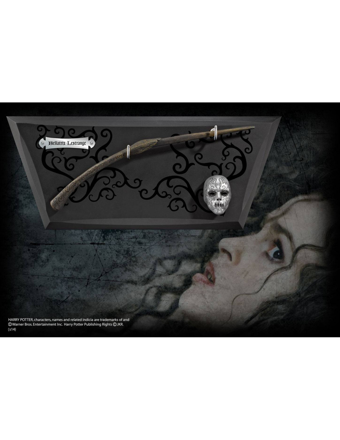 Réplique taille rélle de la baguette de Bellatrix Lestrange, taille env. 35 cm. Livrée en boîte de collection avec support mural et mini masque de Death Eater (Mangemort).