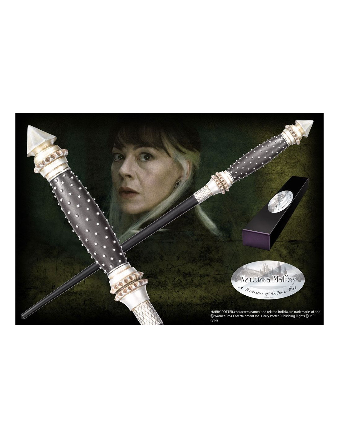 Réplique en résine peinte à la main de la baguette de Narcissa Malfoy, livrée en boîte de collection avec clip métal assorti.
