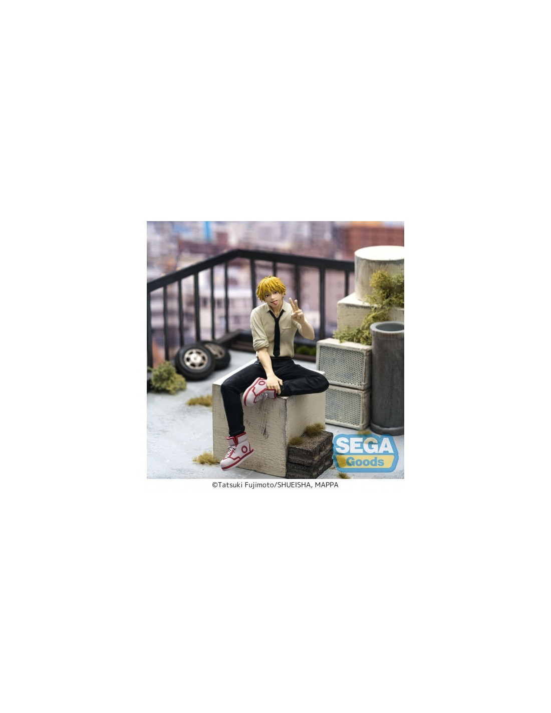 Figurine de Denji tirée de la série Chainsaw Man et la collection Chokonose / Perching PM Ver. La figurine mesure 14 cm de hauteur. Produit officiel par Sega.