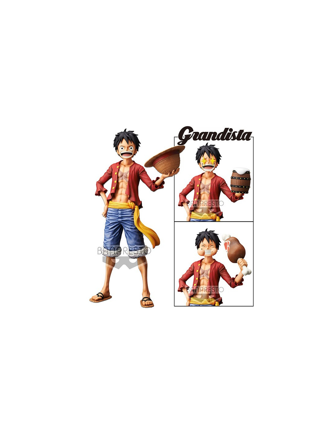Figurine de One Piece, Monkey D. Luffy, collection GRANDISTA. Des bras et têtes supplémentaires sont fournis pour changer la pose et les expressions du visage. Elle mesure 28cm et est présentée en boite-vitrine.