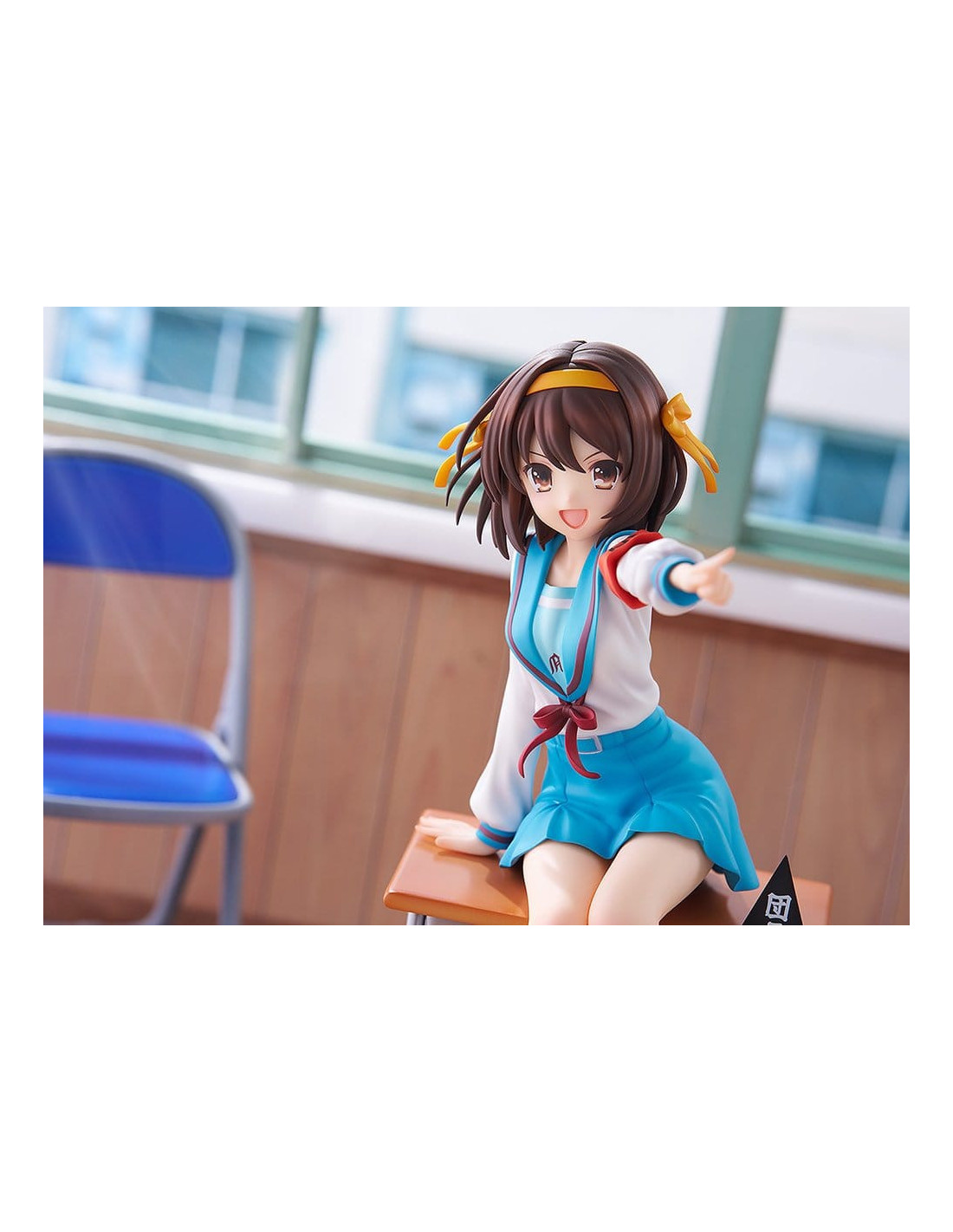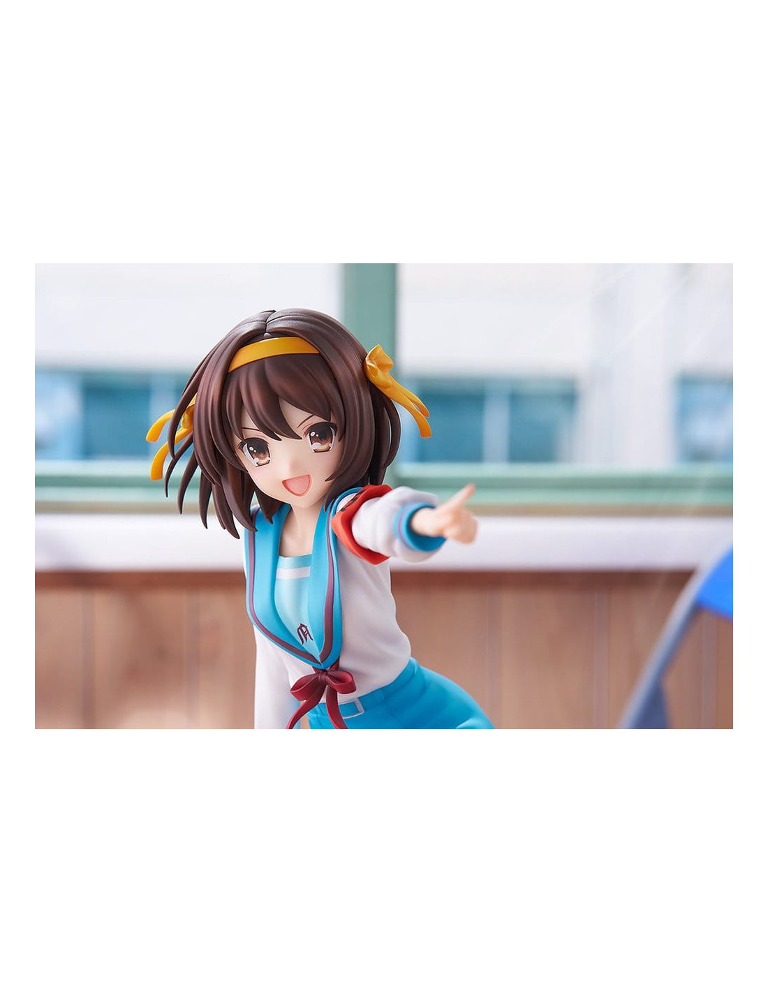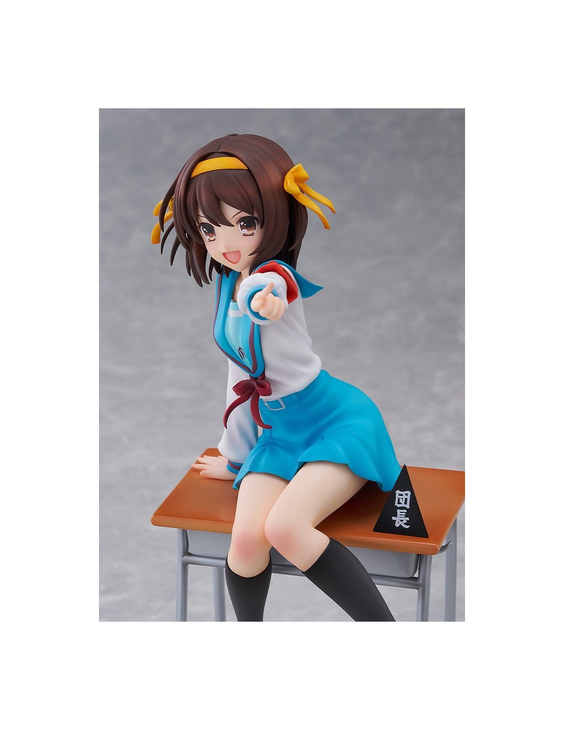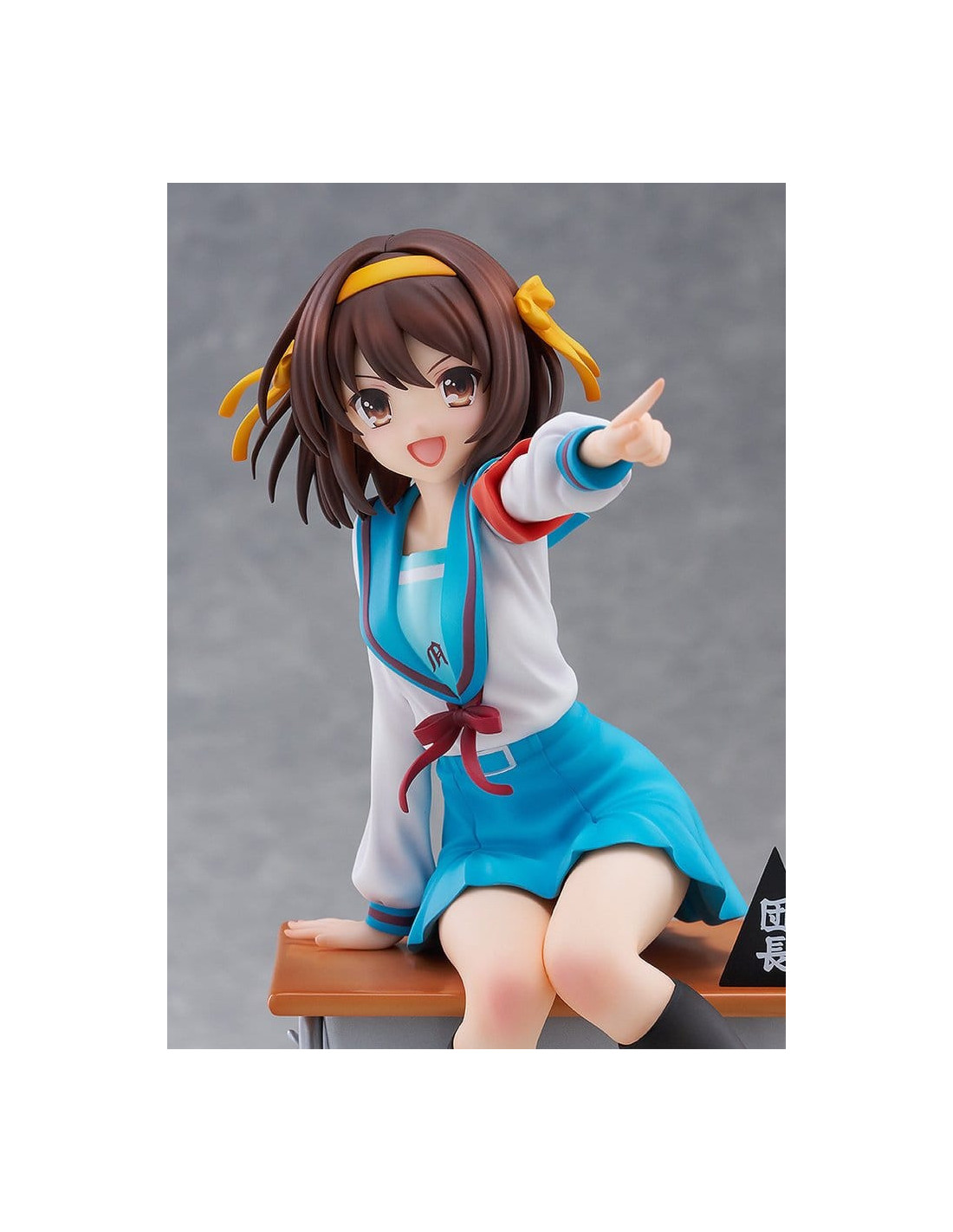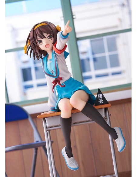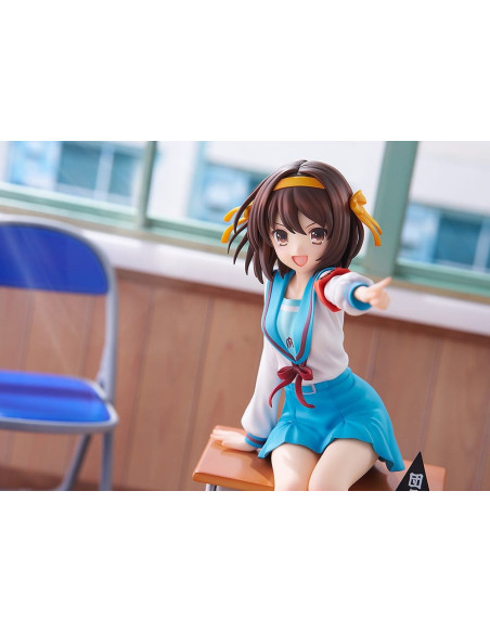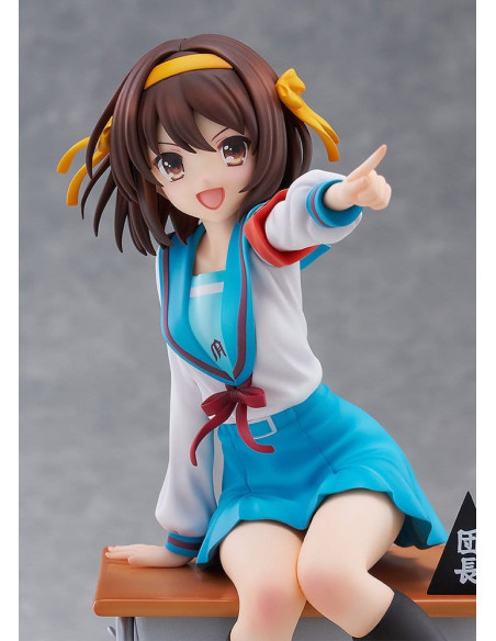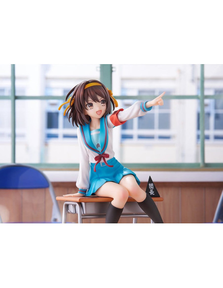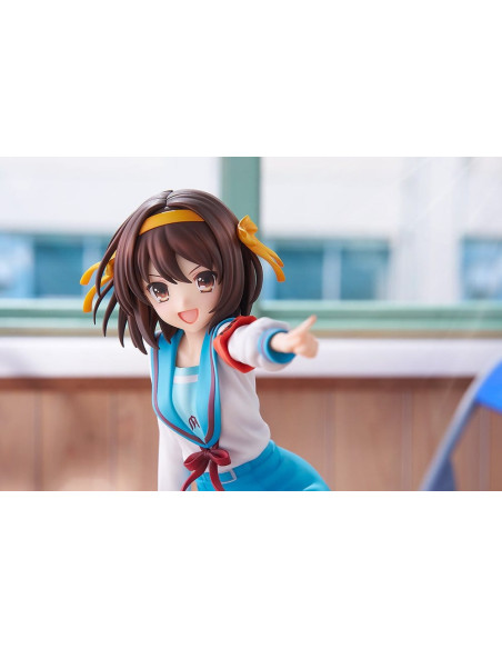 Elle est sculptée dans une pose dynamique, penchée en avant comme si elle était sur le point de parler, incarnant pleinement la personnalité énergique de Haruhi.