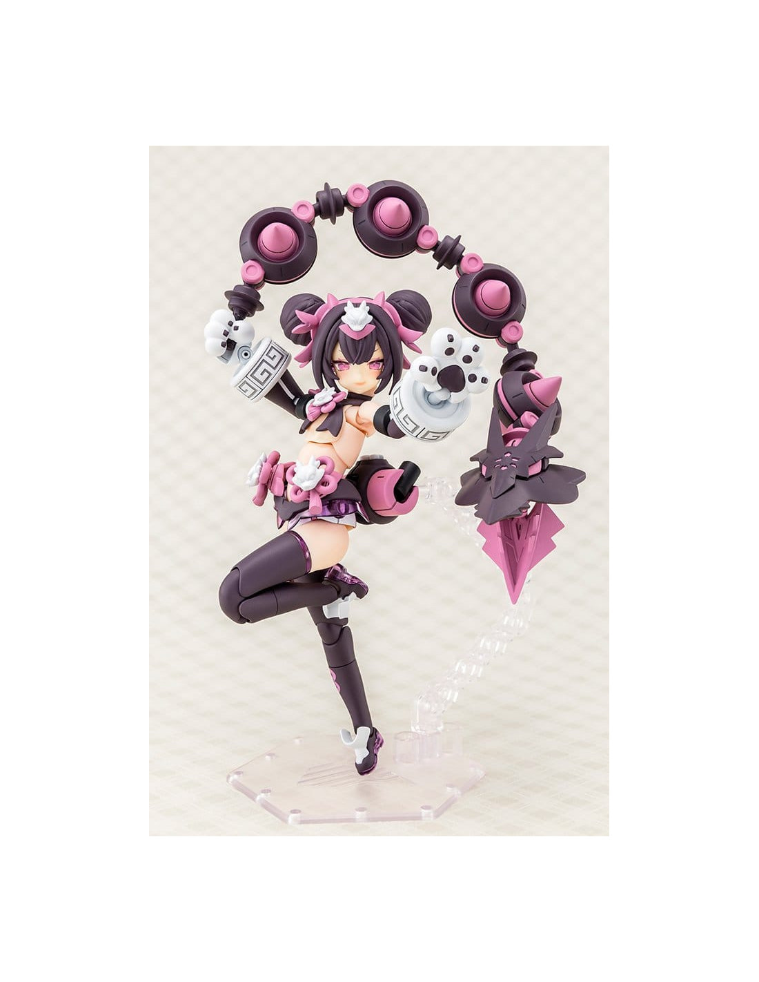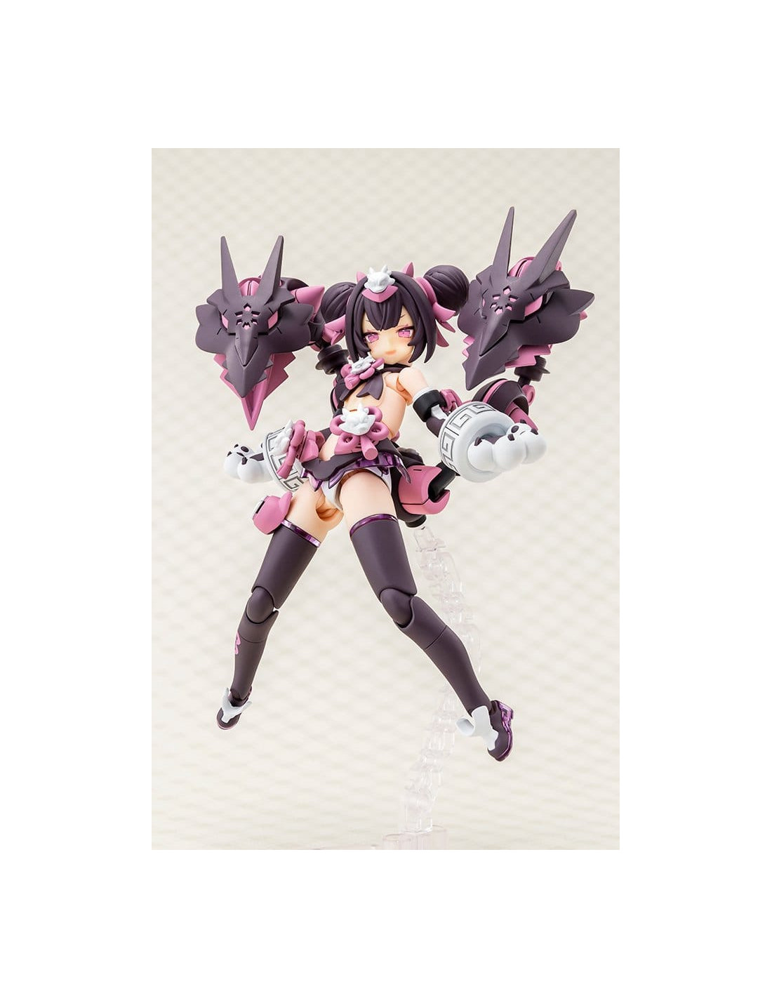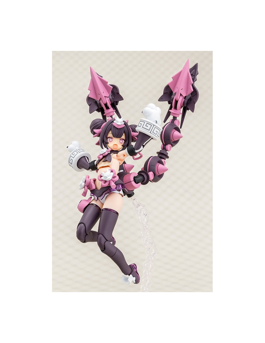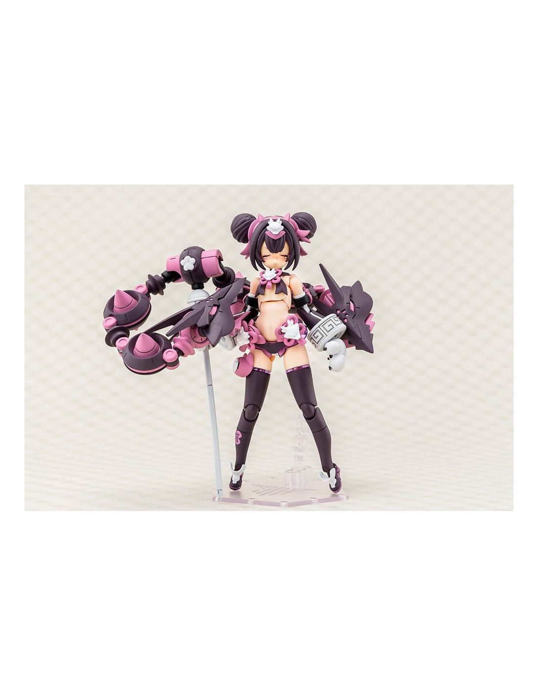 Voici PUNI?MOFU LONG, la dernière-née de la série Megami Device, une gamme de maquettes en plastique alliant des beautés au style bishoujo à des armes et armures ultra-puissantes ! Long est le tout dernier personnage à rejoindre la série PUNI?MOFU ! Dotée de la même silhouette menue que Mao et Tu, Long se distingue par ses armes emblématiques au design de têtes de dragon jumelles qui ne manquent pas de faire forte impression ! Le design est une nouvelle fois signé par l'illustrateur BLADE ! Le corps Machineca Block2-S est une version réduite du corps Machineca Block2-M conçu par Masaki Apsy, qui rend pleinement justice à la mignonnerie du concept art. Caractéristiques du modèle : - Le nouveau design du personnage illustré par BLADE s'inspire d'un concept de dragon. - Les armes principales, les « Twin Dragon Fangs », sont dotées de multiples articulations permettant de réaliser diverses poses d'action. - La jupe et les bracelets nouvellement conçus créent une silhouette unique par rapport aux modèles PUNI?MOFU précédemment commercialisés. - Comprend trois visages. - Comprend des autocollants pour le marquage sur les jambes et les pièces colorées. - Assemblez différentes pièces pour profiter d’une variété de silhouettes, y compris les proportions pures et non modifiées du « mode non armé » et le « mode armé » entièrement équipé. - Les pièces peuvent être configurées pour présenter le modèle en armure complète en « mode armé », ou sans armure en « mode non armé ». - Le corps de base Machineca offre une flexibilité impressionnante, permettant de le présenter dans une variété de poses naturelles, comme tenant une arme à la main ou assis. - Le kit comprend une variété d’armes et de pièces articulées pouvant être utilisées pour créer différentes scènes de combat. - Un socle spécial est inclus. - Les points de connexion de 3 mm sur chaque pièce et les pièces de compatibilité pour la tête permettent de personnaliser ce modèle avec des pièces existantes des séries M.S.G, Frame Arms, Frame Arms Girl, Hexa Gear, Sousai Shojo Teien, Arcanadea et Megalomaria. Qu’est-ce que « Megami Device » ? La série Megami Device de Kotobukiya est une gamme de kits de maquettes en plastique de 14 cm (5½ pouces) accompagnés d’une gamme d’armes et d’équipements qui vous permettent de prendre plaisir à construire et à personnaliser votre propre Megami Device pour l’utiliser dans des combats de robots. Chaque personnage dispose d’un corps principal, ou « machineca », conçu par Masaki Apsy, tandis que l’armure et la mécanique uniques des modèles sont conçues en collaboration avec divers illustrateurs invités. Les kits sont livrés avec des pièces multicolores et des pièces de visage pré-imprimées par tampographie, ce qui les rend faciles à assembler sans nécessiter de peinture. Les kits sont équipés de joints de 3 mm, ce qui les rend compatibles avec toutes les armes de la gamme Megami Device ainsi qu’avec les autres séries de maquettes en plastique de Kotobukiya !