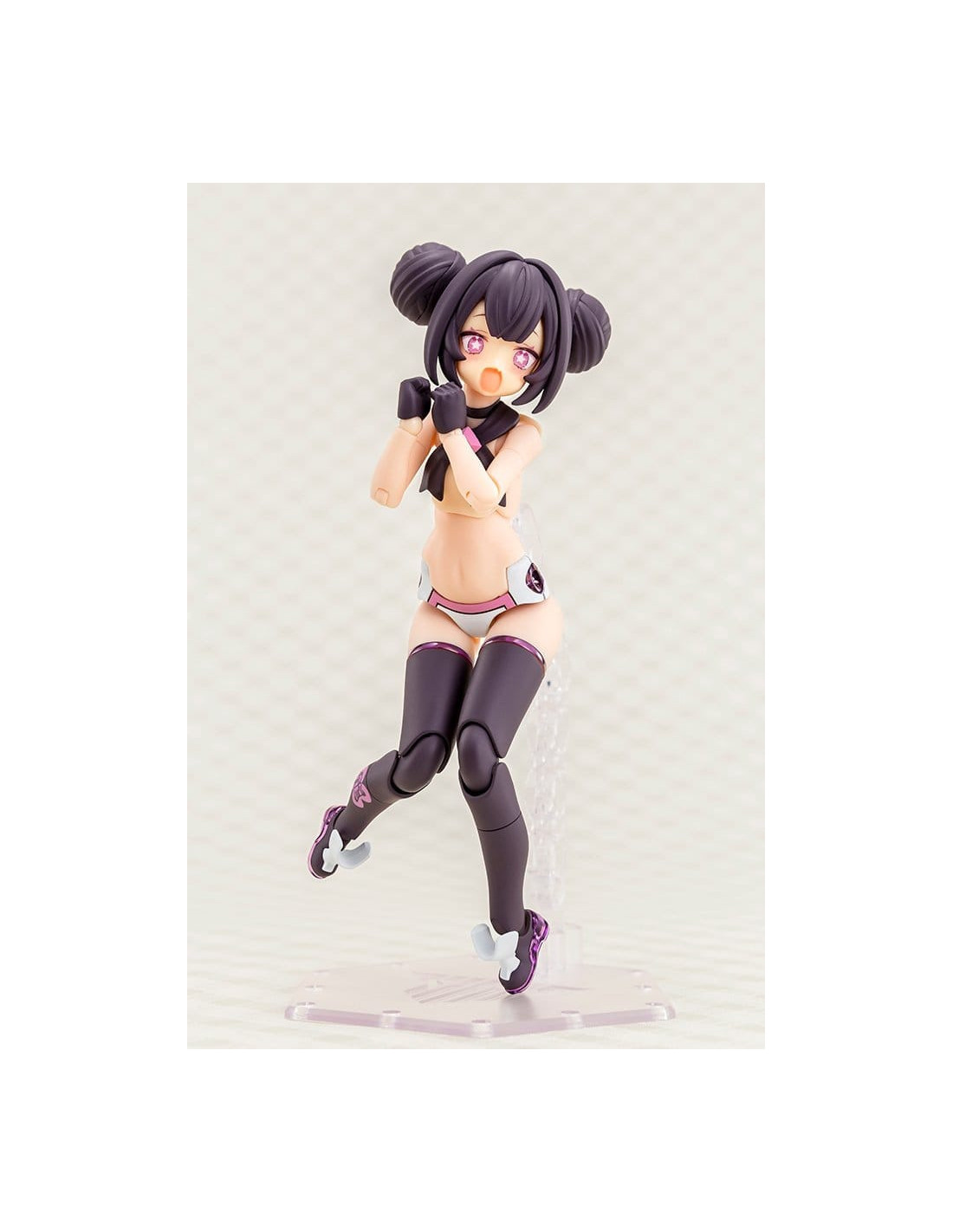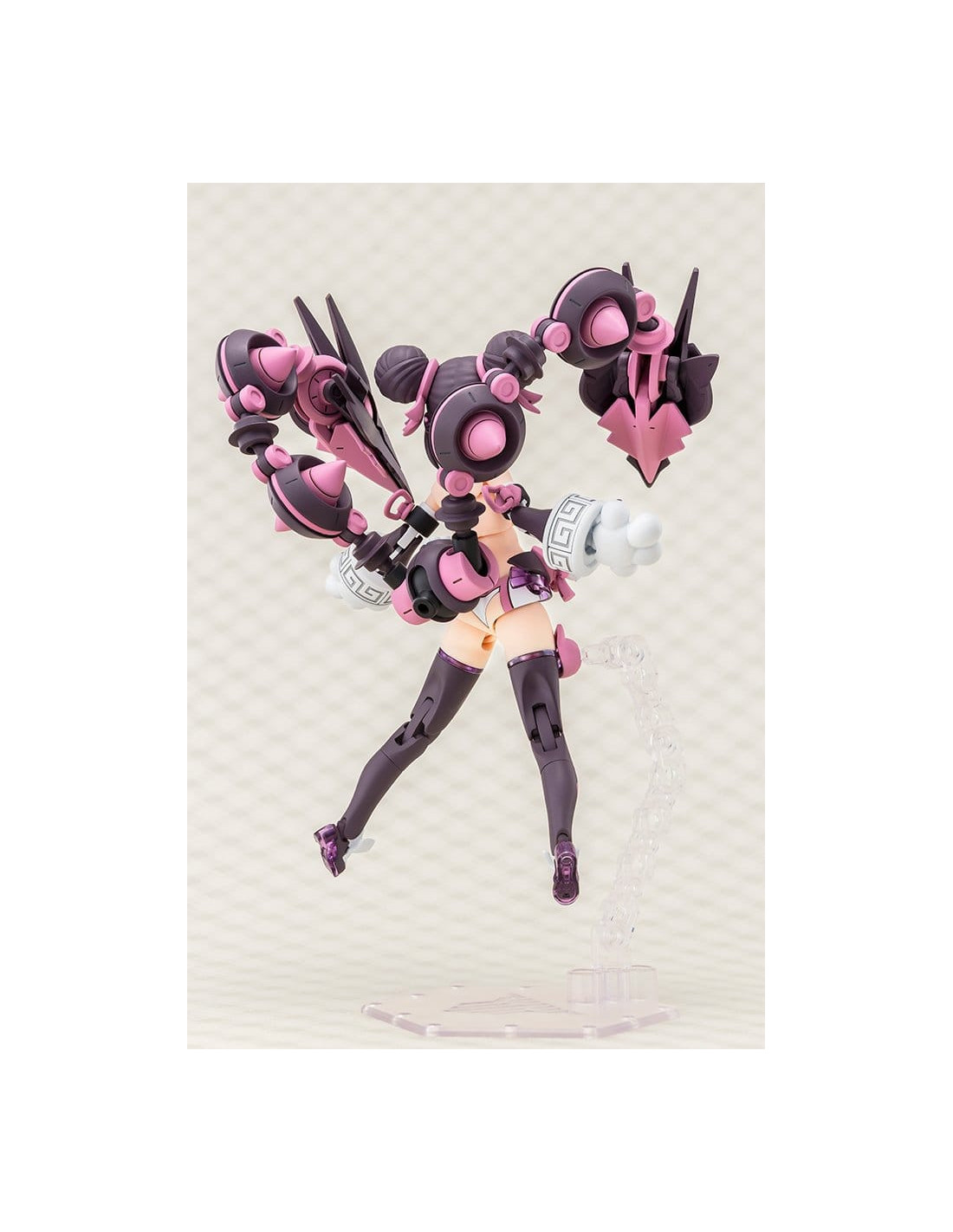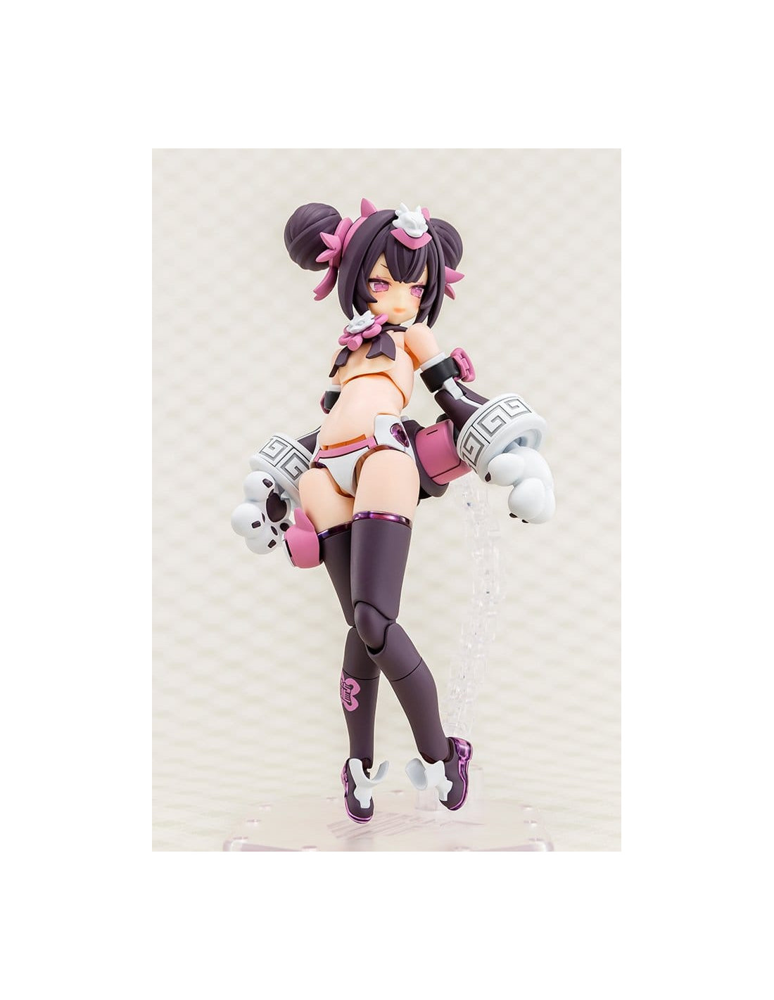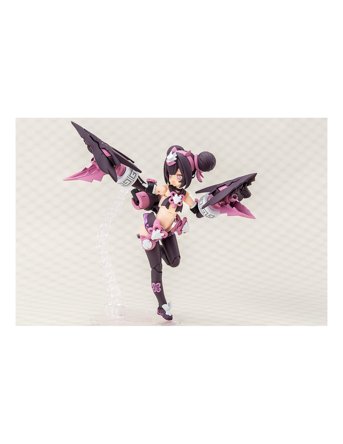 Voici PUNI?MOFU LONG, la dernière-née de la série Megami Device, une gamme de maquettes en plastique alliant des beautés au style bishoujo à des armes et armures ultra-puissantes ! Long est le tout dernier personnage à rejoindre la série PUNI?MOFU ! Dotée de la même silhouette menue que Mao et Tu, Long se distingue par ses armes emblématiques au design de têtes de dragon jumelles qui ne manquent pas de faire forte impression ! Le design est une nouvelle fois signé par l'illustrateur BLADE ! Le corps Machineca Block2-S est une version réduite du corps Machineca Block2-M conçu par Masaki Apsy, qui rend pleinement justice à la mignonnerie du concept art. Caractéristiques du modèle : - Le nouveau design du personnage illustré par BLADE s'inspire d'un concept de dragon. - Les armes principales, les « Twin Dragon Fangs », sont dotées de multiples articulations permettant de réaliser diverses poses d'action. - La jupe et les bracelets nouvellement conçus créent une silhouette unique par rapport aux modèles PUNI?MOFU précédemment commercialisés. - Comprend trois visages. - Comprend des autocollants pour le marquage sur les jambes et les pièces colorées. - Assemblez différentes pièces pour profiter d’une variété de silhouettes, y compris les proportions pures et non modifiées du « mode non armé » et le « mode armé » entièrement équipé. - Les pièces peuvent être configurées pour présenter le modèle en armure complète en « mode armé », ou sans armure en « mode non armé ». - Le corps de base Machineca offre une flexibilité impressionnante, permettant de le présenter dans une variété de poses naturelles, comme tenant une arme à la main ou assis. - Le kit comprend une variété d’armes et de pièces articulées pouvant être utilisées pour créer différentes scènes de combat. - Un socle spécial est inclus. - Les points de connexion de 3 mm sur chaque pièce et les pièces de compatibilité pour la tête permettent de personnaliser ce modèle avec des pièces existantes des séries M.S.G, Frame Arms, Frame Arms Girl, Hexa Gear, Sousai Shojo Teien, Arcanadea et Megalomaria. Qu’est-ce que « Megami Device » ? La série Megami Device de Kotobukiya est une gamme de kits de maquettes en plastique de 14 cm (5½ pouces) accompagnés d’une gamme d’armes et d’équipements qui vous permettent de prendre plaisir à construire et à personnaliser votre propre Megami Device pour l’utiliser dans des combats de robots. Chaque personnage dispose d’un corps principal, ou « machineca », conçu par Masaki Apsy, tandis que l’armure et la mécanique uniques des modèles sont conçues en collaboration avec divers illustrateurs invités. Les kits sont livrés avec des pièces multicolores et des pièces de visage pré-imprimées par tampographie, ce qui les rend faciles à assembler sans nécessiter de peinture. Les kits sont équipés de joints de 3 mm, ce qui les rend compatibles avec toutes les armes de la gamme Megami Device ainsi qu’avec les autres séries de maquettes en plastique de Kotobukiya !